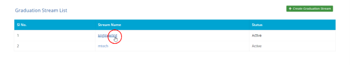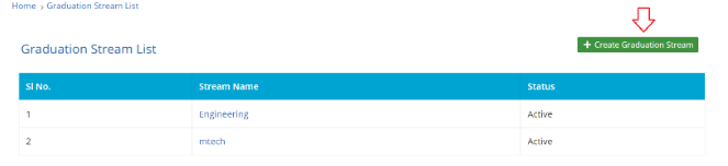 This page displays the list of graduation stream in this application. This graduation stream is to be mapped with the Application Programs in later stage. Based on this Graduation stream, the candidate will get program choices in the login page to register. To add a new Graduation -