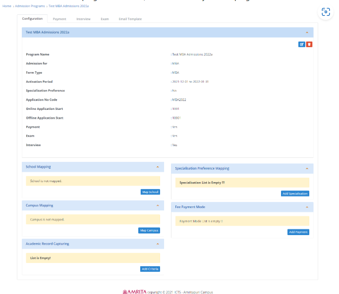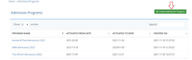 Once the new admission program is created, click on the newly created program name from list.