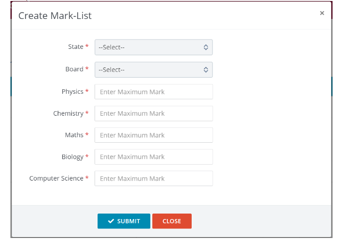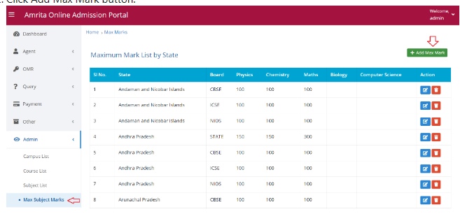 Here you can define maximum marks for the subjects based on states and boards. To add a new set of marks-
