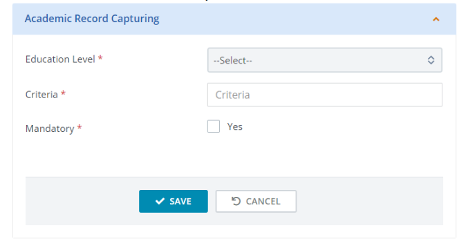 Select Education level required for this program. Enter Criteria which is required for this program.
