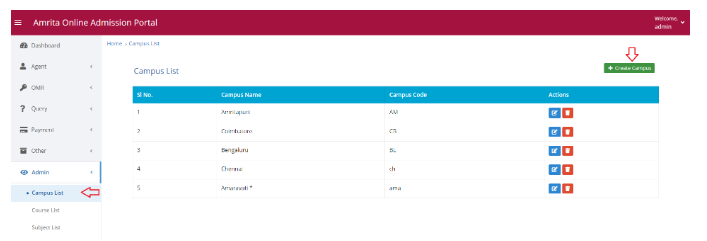 This page displays the list of campuses. Here you can add new campus to this application. To add new campus -