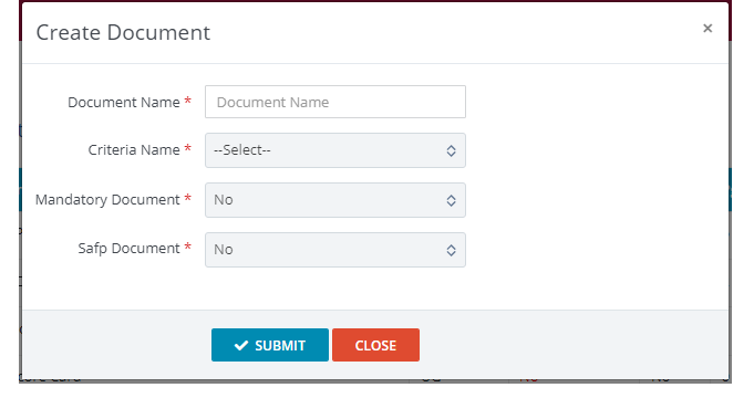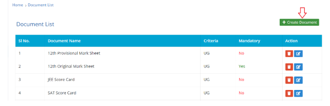 This is the page where you need to define which all documents are required for applying the admission program. To create a new document type -