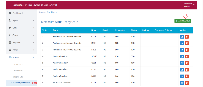 Here you can define maximum marks for the subjects based on states and boards. To add a new set of marks-