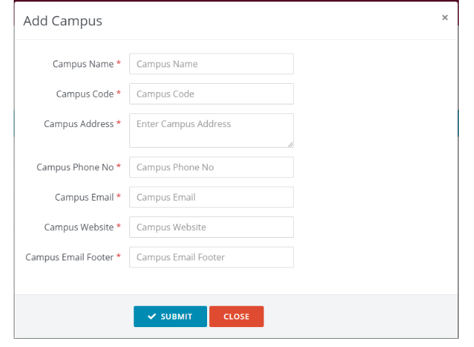 This page displays the list of campuses. Here you can add new campus to this application. To add new campus -