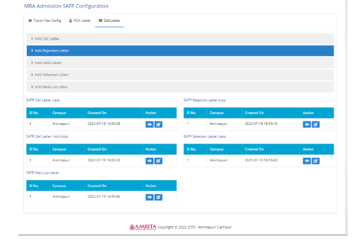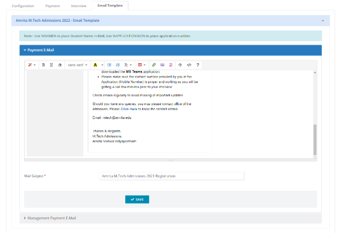 Here you can add the email templates of campus-based below-mentioned letters, which will be used to send automatically to the applicant. You can create your own HTML templates and add them here using the code view option in the toolbar.