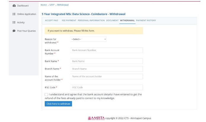 Amrita Online Admission Portal (AOAP) guides the candidates with simple steps through the admission procedure. Candidates need to submit the relevant proof of documents while pursuing admissions. Certain candidates may find it difficult in processing the required documents within the prescribed time period. In view of this, the candidate can avail of the provision of submitting an undertaking stating the date of document submission from their side.