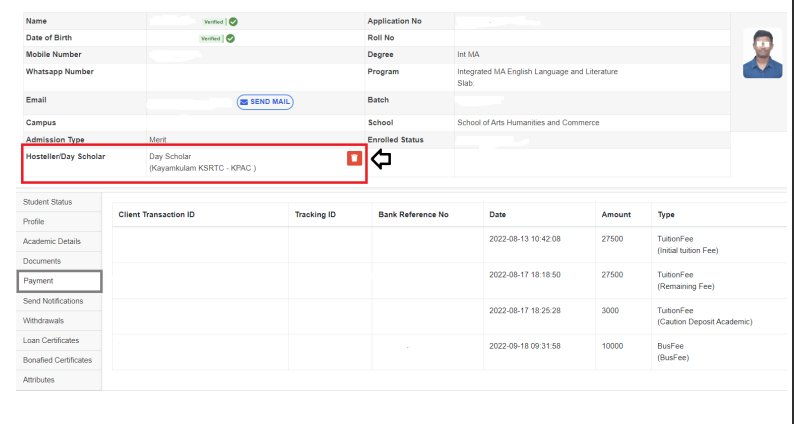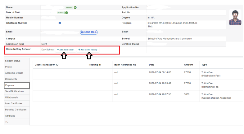 Change Student Category to Hosteller/Day Scholar or remove an availed facility