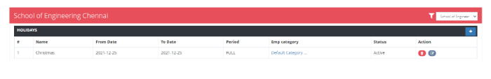 Created Holidays will be listed in the Holidays list. You can edit or delete the holiday by clicking the Edit or Delete button under Action.