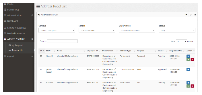 HRMS is an indigenous application that helps the Organization to accumulate and maintain Human Resource data. This document describes how a staff requests address proof.