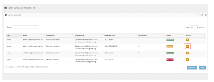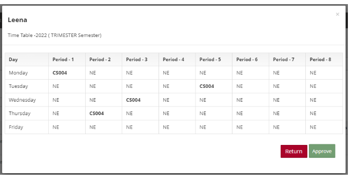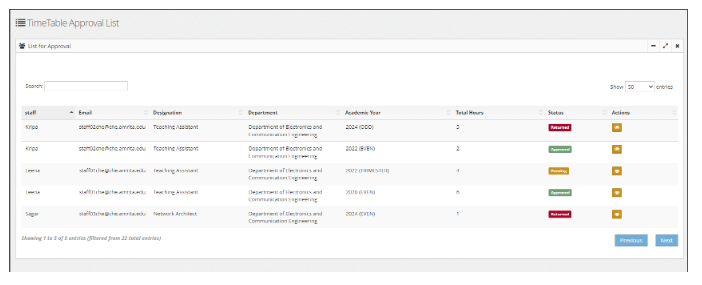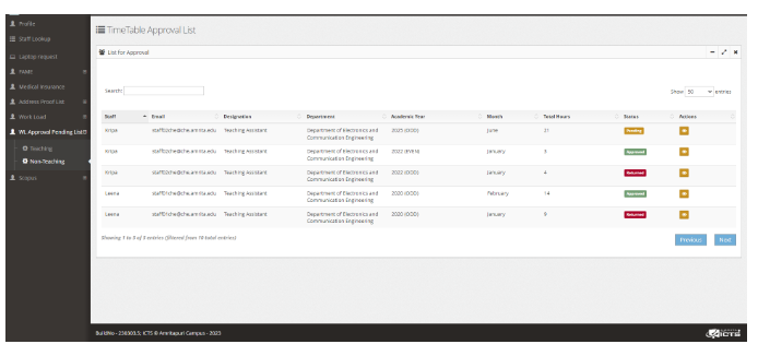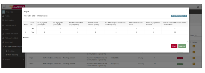 Each staff needs to show the teaching or non-teaching works they are engaged in or allotted with. The workload submitted by the staffs needs to be reviewed and get approval from the Head of the department. HOD can either concede or return the staff's submission.