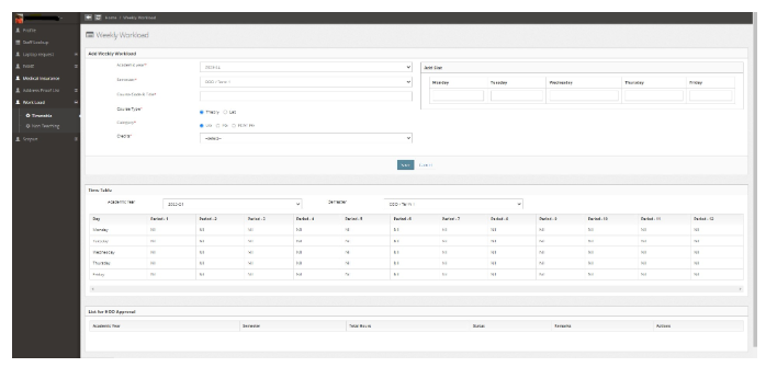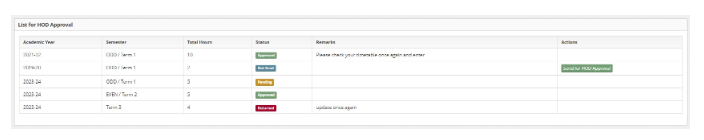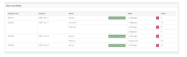 Each staff needs to show the teaching or non-teaching works they are engaged in or allotted with. The workload submitted by the staff needs to be reviewed and get approval from the Head of the department. HOD can either concede or return the staff's submission.