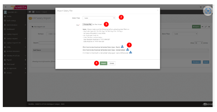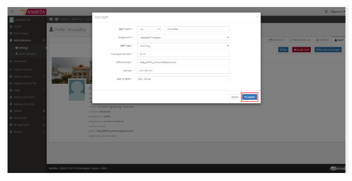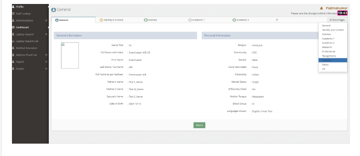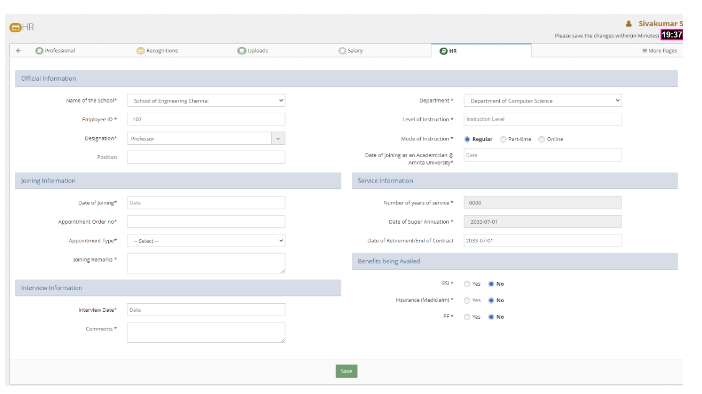 FMS in HRMS will be a scaffolding for HR-related processes of staff joining the organization. The HR will create a user account for new staff and all staff should fill in the details in FMS. Once the account has been created, the joining date should be specified on the HR page of the newly joined staff's FMS. New staff will get 15 days starting from the joining date mentioned on the HR page to fill in the FMS details. After 15 days, the FMS pages will be locked and the staff needs to contact the HR department for further correction/update of details.