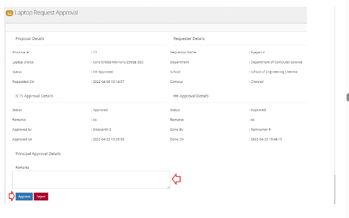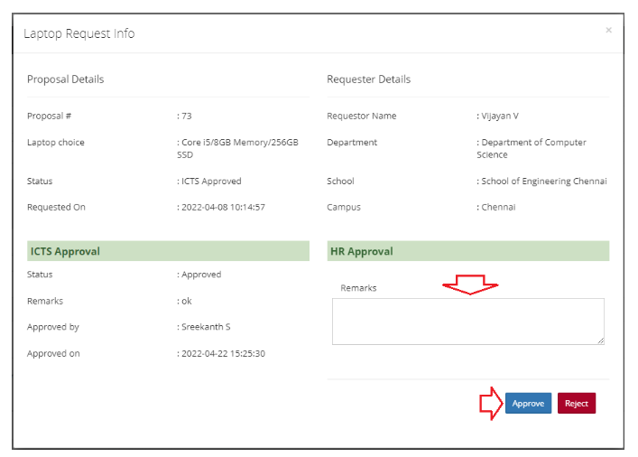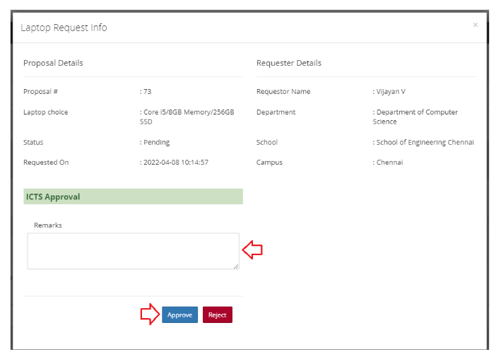 The laptop request Info page will open. Add Remarks and click on the Approve button.