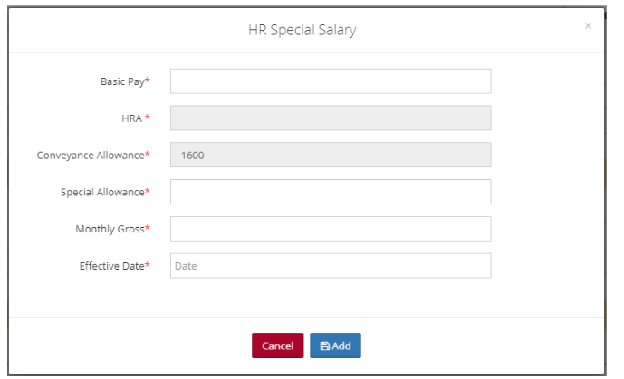 special Salary window opens up. Fill in the following details and click on the Add button.