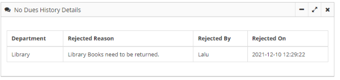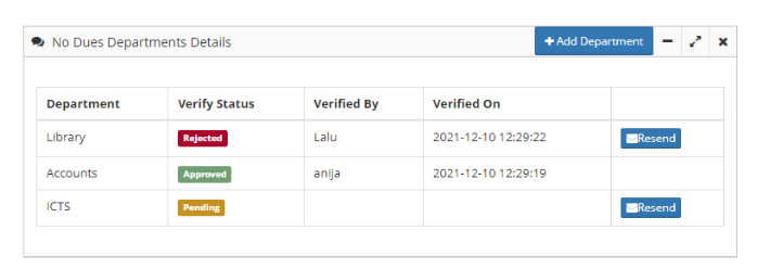 Email can be resend after closing all dues. Rejection history will be displayed under No Dues History details.