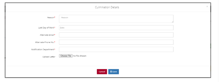 Add Reason, Last day of work, Alternate email, Alternate phone number, Notification / No Dues Departments, and upload any documents to attach.