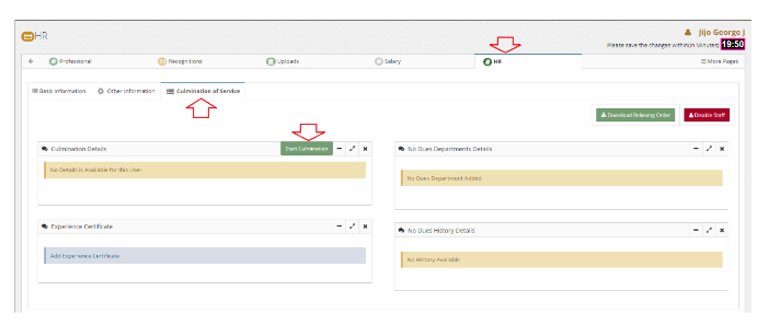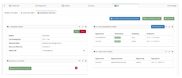 For a staff get relieve, he/she must clear all no-dues approval from certain departments. The HR department needs to send notifications to these departments regarding the culmination service of the staff.