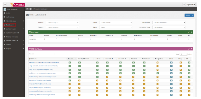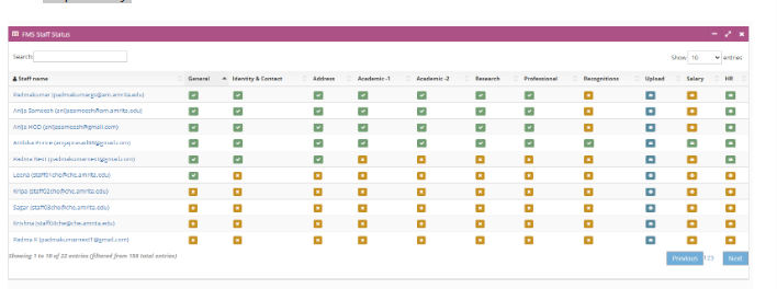 The FMS Staff Status table shows the staff-wise status. Those in green color tick are filled pages and those in the yellow cross need to be filled by staff.
