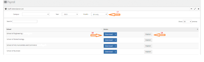Select the campus, Year, and Month. Then all the schools under the campus will be listed.