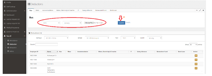 13. For bulk entry, you can go to each deduction session, and upload the deduction amount in the sample format provided.
