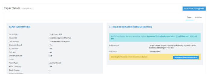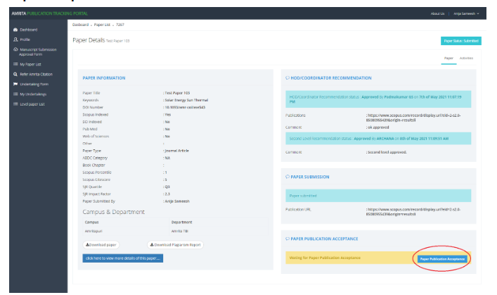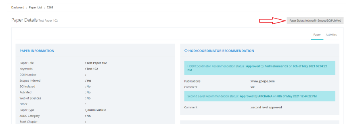 Enter the publication details and upload the final paper. The department coordinator can also update the status if, the user is not available.