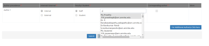 While selecting faculty author, a drop-down will show the suggestions with the mail id of the faculty author, the student’s roll number will be shown along with their name.