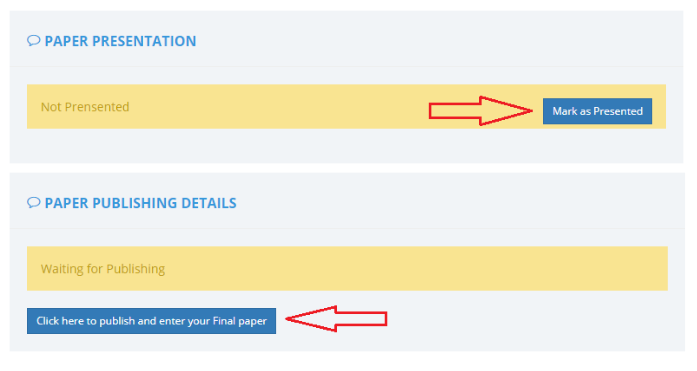 Once the paper gets published in a Journal/Conference, the user should mark it as presented.
