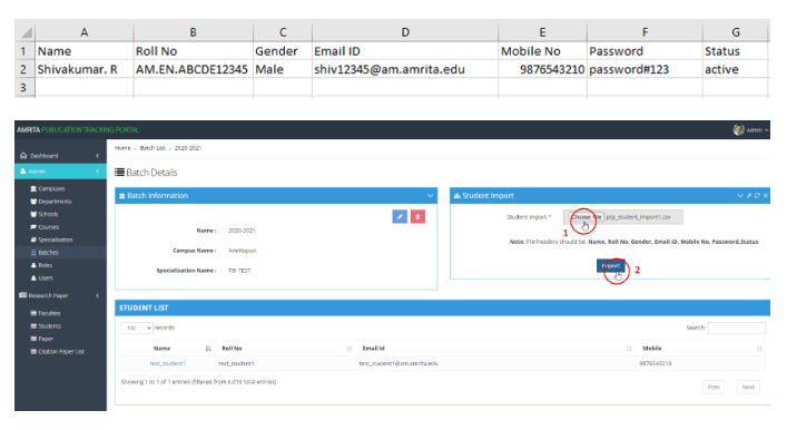 • Make sure the csv file has Name, Roll No, Gender, Email ID, Mobile No, Password, Status each as header exactly as like the sample shown below.