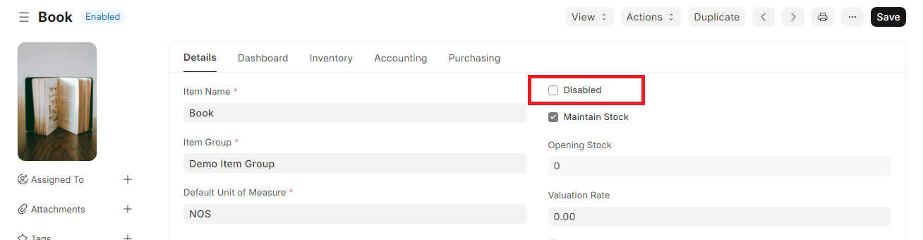 To change status of the item, go to an item, mark Disabled / Enabled option accordingly.