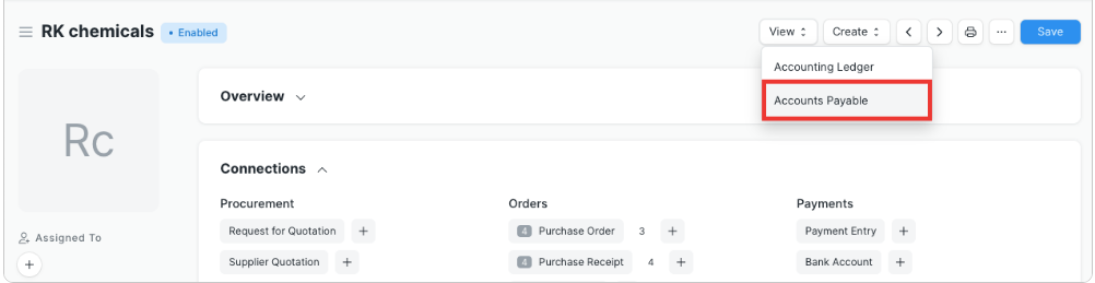 By clicking on the View button, you can view the Accounting Ledger or Accounts Payable directly for this supplier.