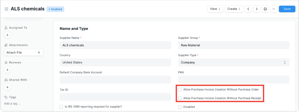 If the "Purchase Order Required" or "Purchase Receipt Required" option is configured as "Yes" in Buying Settings, it can be overridden for a particular supplier by enabling the "Allow Purchase Invoice Creation Without Purchase Order" or "Allow Purchase Invoice Creation Without Purchase Receipt" in the Supplier Master.