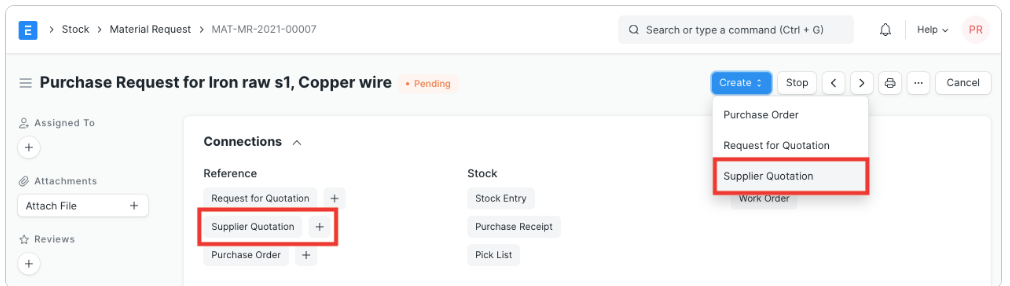 From here either select the Supplier Quotation from the list shown upon clicking Create or go to Connections tab, click (+) near to Supplier Quotation.